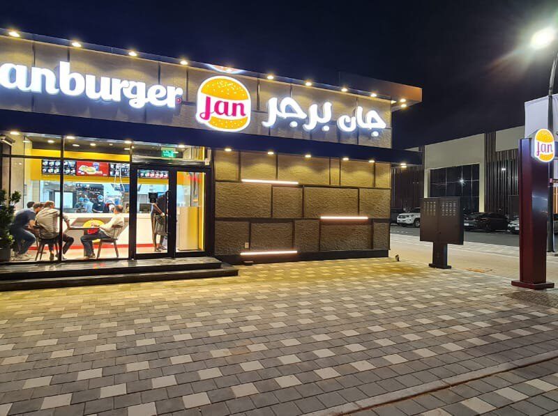 Jan Burger – Dammam Road At Jan Burger Project our team was responsible of all exterior works applying all architectural and elevation works, from aluminum cladding, windows and doors, HPL words, logo fixing, lighting work. As we executed all interior works and furniture suppling.