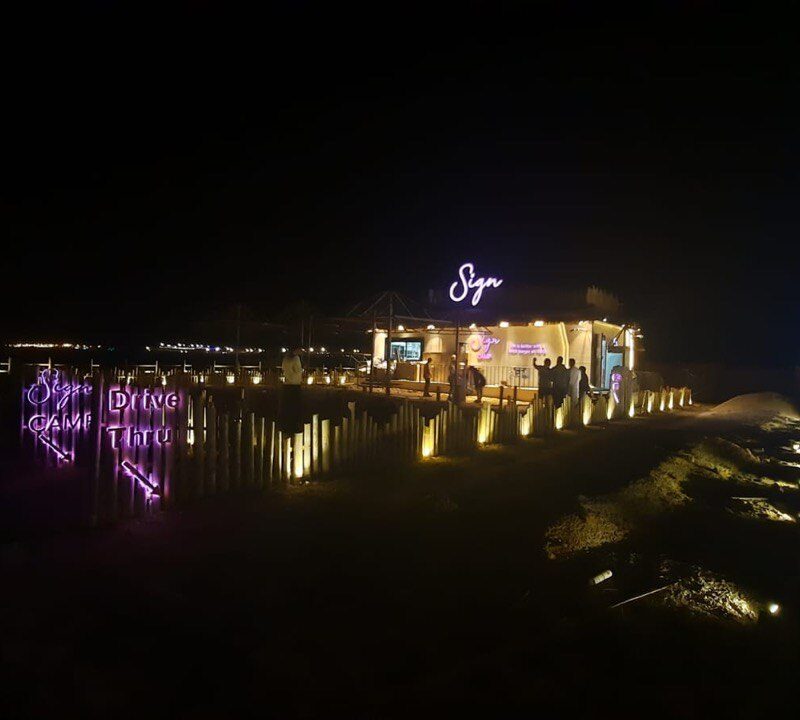 Sign-Al Thamam Camp At Pizza Hut Project our team was responsible of all exterior works applying all architectural and elevation works, from aluminum cladding, windows and doors, HPL words, logo fixing, lighting work. As we executed all interior works and furniture suppling.